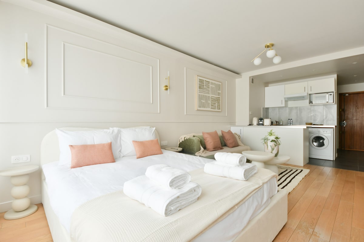 Ubicado en el corazón de París, cerca de los Campos Elíseos y del Parc Monceau, este estudio de 31 m2 fue completamente renovado en 2021. Este estudio tiene: - Confortable cama doble - Armarios, plancha, - Smart TV - WiFi - Cocina equipada - Lavadora, secadora , tendedero - baño con una gran ducha, WC, secador de pelo - Espacio de trabajo equipado con escritorio e internet Se encuentra a pocos minutos a pie: metro, panaderías, restaurantes, lavandería, mini-mercados, farmacias.