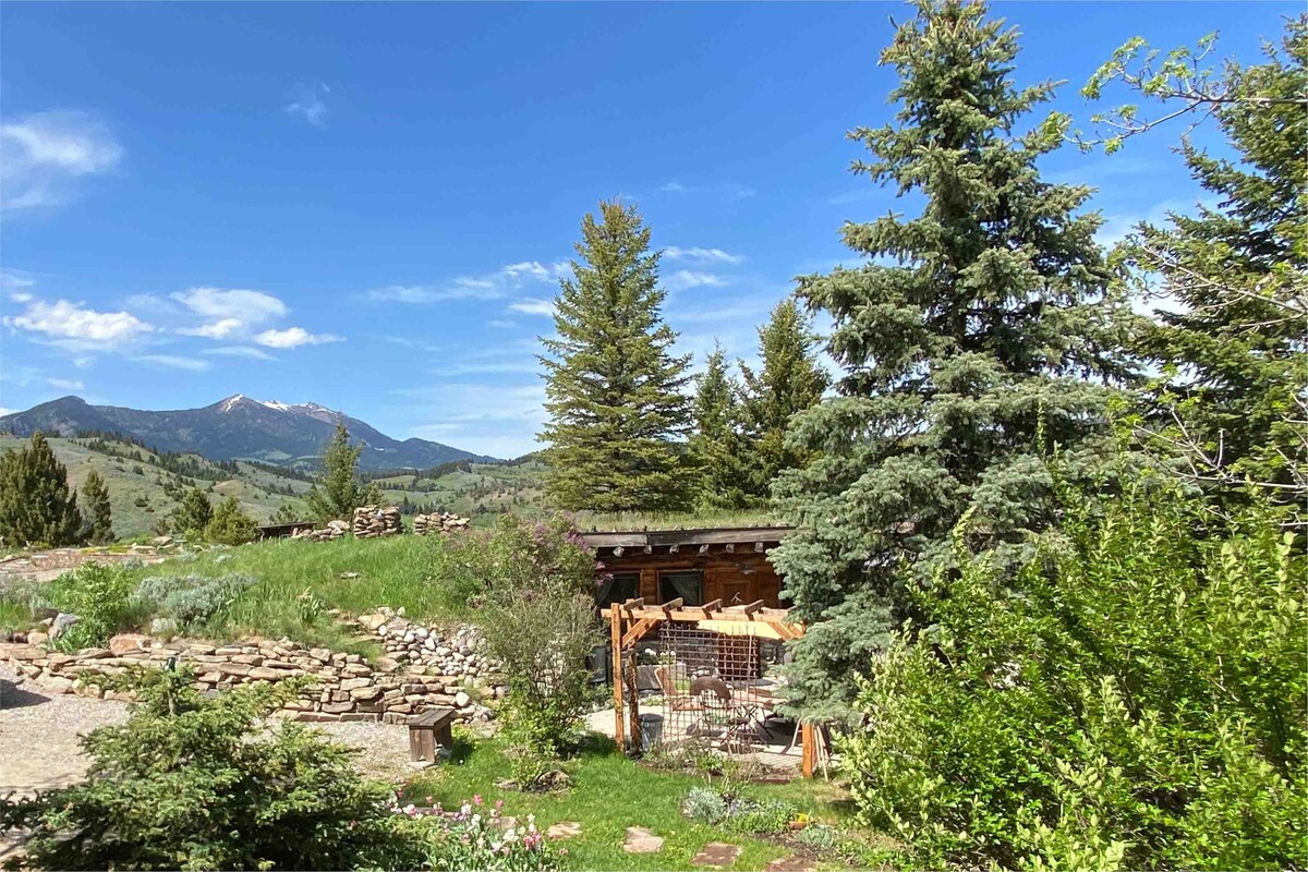 Una casa de troncos y tablones bellamente construida, sencilla y sólida, única, acogedora, ¡una estructura mágicamente iluminada! Ubicada en las colinas a 4 millas al este de la ciudad (8 minutos en coche). Mientras conduces hacia la propiedad, disfrutarás de vistas de todo el valle de Gallatin y las cordilleras en todas las direcciones. • Zona de esquí Bridger Bowl (15 minutos) • Área de esquí nórdico de Rocky Creek justo al final de la colina (¡esquía allí!) • Cerca del parque Yellowstone (~1,5 horas). • Rocky Creek para pesca con mosca (a 10 minutos a pie). • ¡Estanque para nadar con cancha de voleibol de playa!