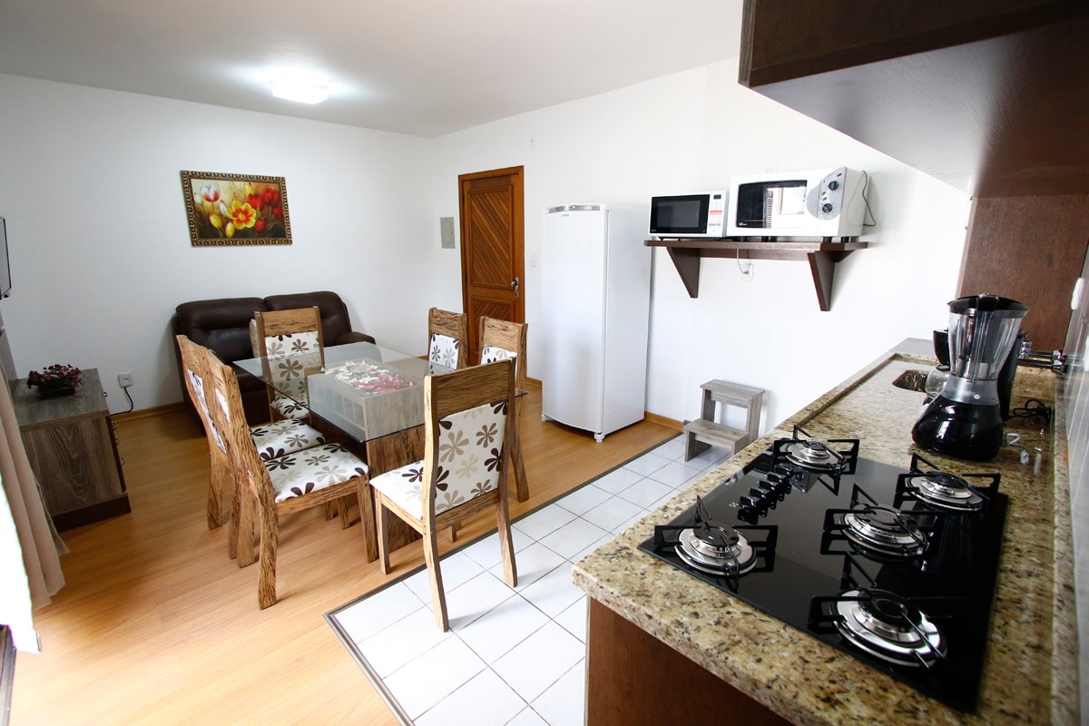 Apartamento muito bem decorado, com lareira, calefação, aquecimento à gás e adega e fica localizado em meio a uma vasta área de mata nativa. A pouco mais de 1Km do centro é possível acessar a "Praça das Etnias", Rodoviária e Rua Coberta com uma caminhada de até 20min. A localização e a estrutura do apartamento e do condomínio permitem tranquilidade e descanso, ao mesmo tempo em que está há apenas a 5min (de carro) da região de bares, cafés, restaurantes e lojas da cidade.