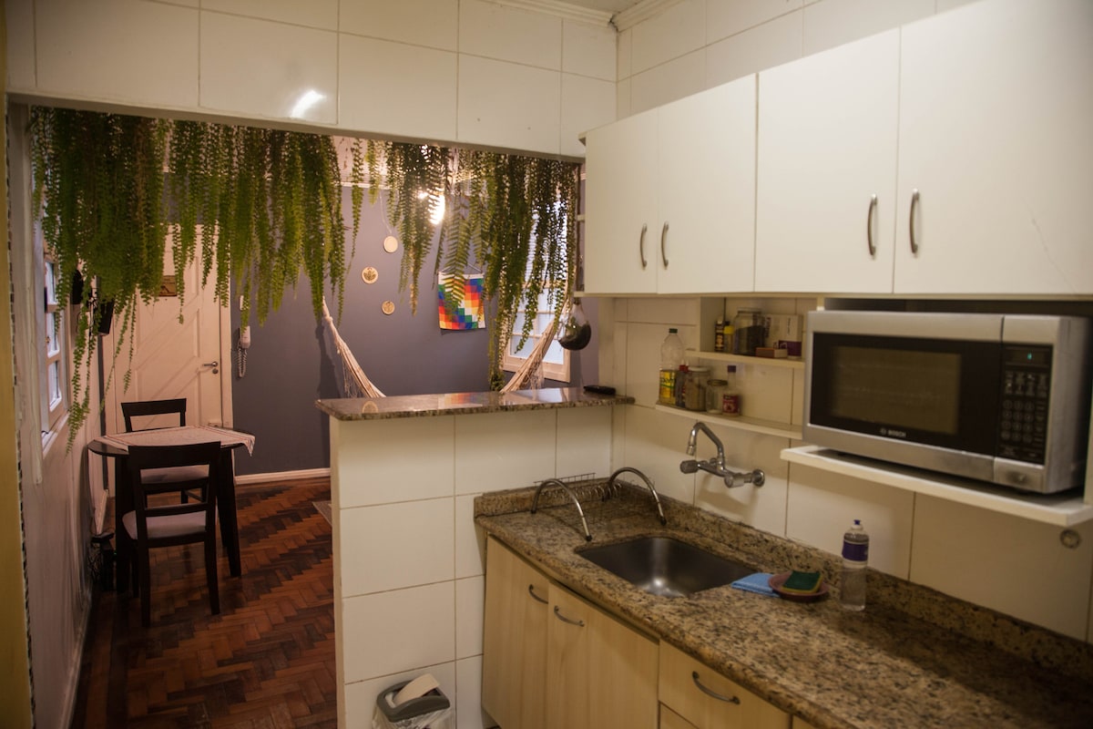 Departamento grande, 2 dormitorios compartidos, súper soleado, tranquilo, con más de una ventana por pieza. Una rareza en Centro Histórico. Junto a la ligereza de un bosque de árboles nativos, donde se escucha el canto de los pájaros. Situado en una región tranquila, llena de matrimonios y edificios históricos, cerca del Orla do Lago Guaíba. Cómodo, acogedor y aireado. Cocina grande y equipada. Ventiladores en todas las partes, aire acondicionado (frío), internet (350 MB) y televisor inteligente.