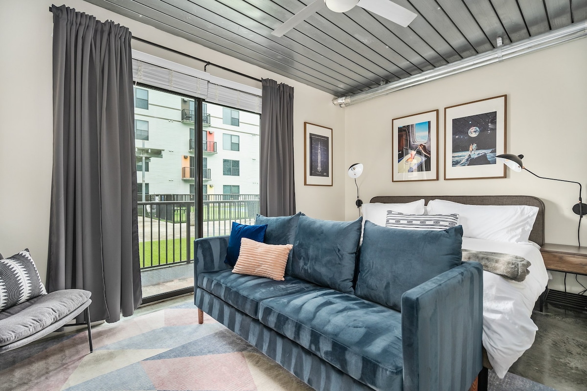 Elegante, cómodo y cuidadosamente amueblado apartamento estudio de 510 pies cuadrados en Lodgeur Midtown. Disfruta de una cocina totalmente equipada, lavadora y secadora en la unidad, WiFi de fibra rápida, espacio de escritorio y acceso a una piscina, gimnasio 24/7 y estacionamiento gratuito. Ideal tanto para estancias cortas como prolongadas. A pocos pasos de bares, restaurantes y el METRORail. Fácil acceso al Texas Medical Center y al centro de Houston.