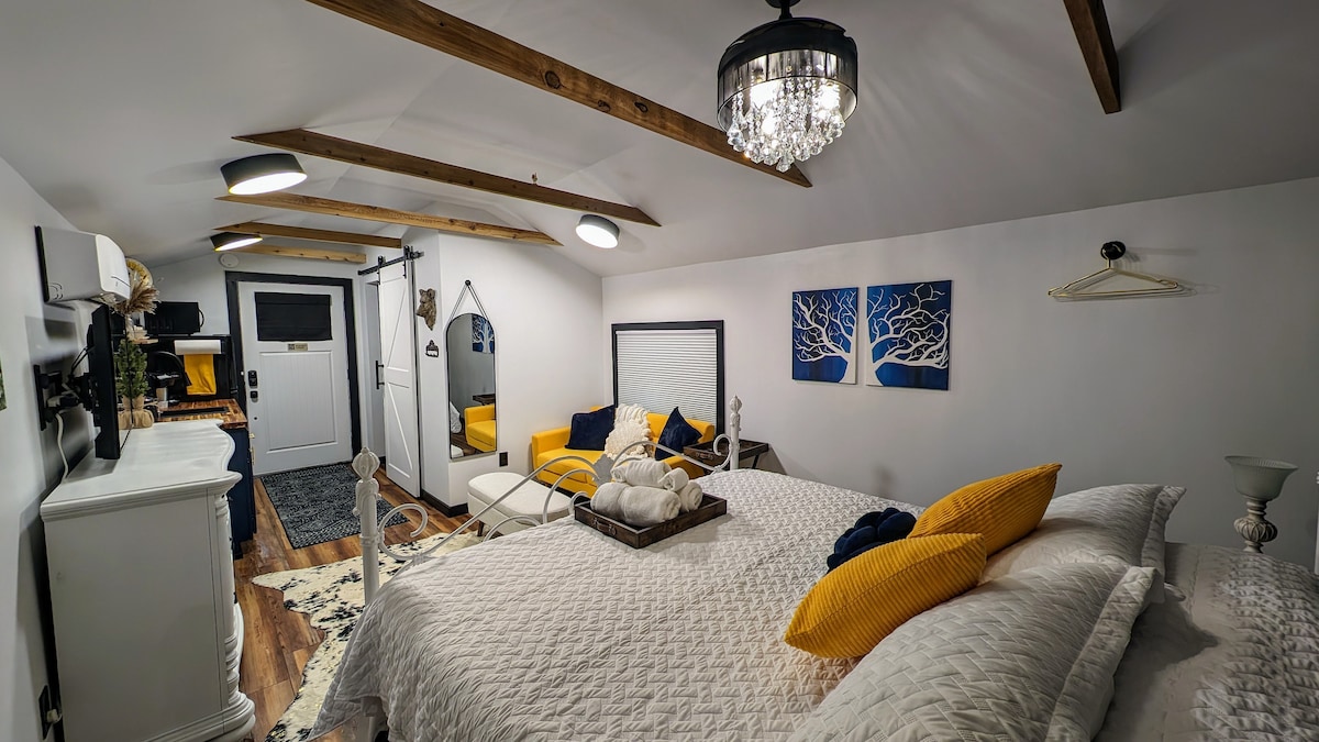 Escápate a la comodidad y el estilo en nuestro estudio bellamente diseñado. Ya sea que estés buscando un relajante retiro en solitario, una escapada romántica o un alojamiento acogedor para dos personas, este tranquilo espacio con temática de playa ofrece el equilibrio perfecto entre comodidad, comodidad y encanto. Te recibirá un interior limpio y moderno que combina la decoración costera con servicios prácticos. La habitación cuenta con una cómoda cama tamaño queen vestida con un impresionante lienzo que crea el ambiente para noches tranquilas y relajantes.