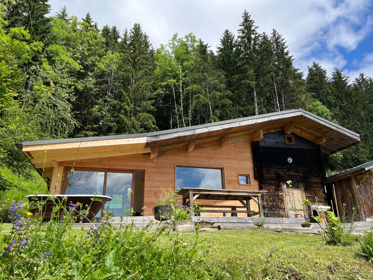 En una tranquilidad absoluta, sin vecinos, un pequeño paraíso natural, amueblado con buen gusto, situado a 1000 m de alt. en el corazón de un hermoso bosque de Alta Saboya con una vista excepcional de las montañas (Alpes/Aravis) y una pequeña claraboya en el Mont-Blanc...