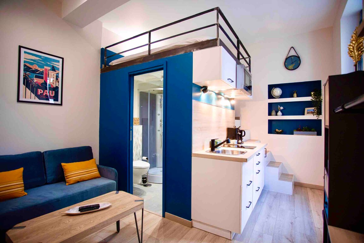 🏡 Tiny'house – Charmant studio de 15 m² en hyper-centre, refait à neuf ! ✨ Cosy et moderne, il offre un salon avec canapé et TV 140 cm 📺, une kitchenette équipée 🍽️, une salle d’eau 🚿 et un coin nuit en mezzanine 🛏️ (lit 160x200). 📍 Idéalement situé dans le quartier du Château de Pau, proche commodités et parkings. Profitez des restaurants, boutiques et sites historiques à deux pas ! 💤 Literie neuve (2025) avec matelas haut de gamme pour des nuits ultra confortables ! ✨