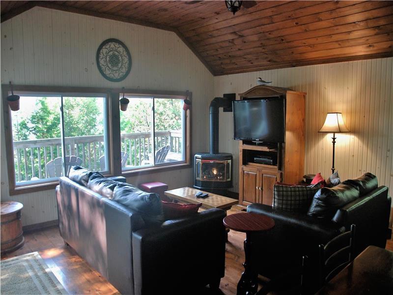 This tiny luxury 2 bedroom cottage is perfect for a romantic couple or small family getaway. Nestled on 1.5 acres among majestic trees and granite outcrops, creates beautiful views from the deck with BBQ, fire pit, hot tub or massive windows throughout the cottage. Water dam and river across the road create relaxing waterfall sounds that are heard from deck or enjoy it close up from the private shoreline deck and dock. Explore the Muskoka River on the kayak, SUP or river tubes.