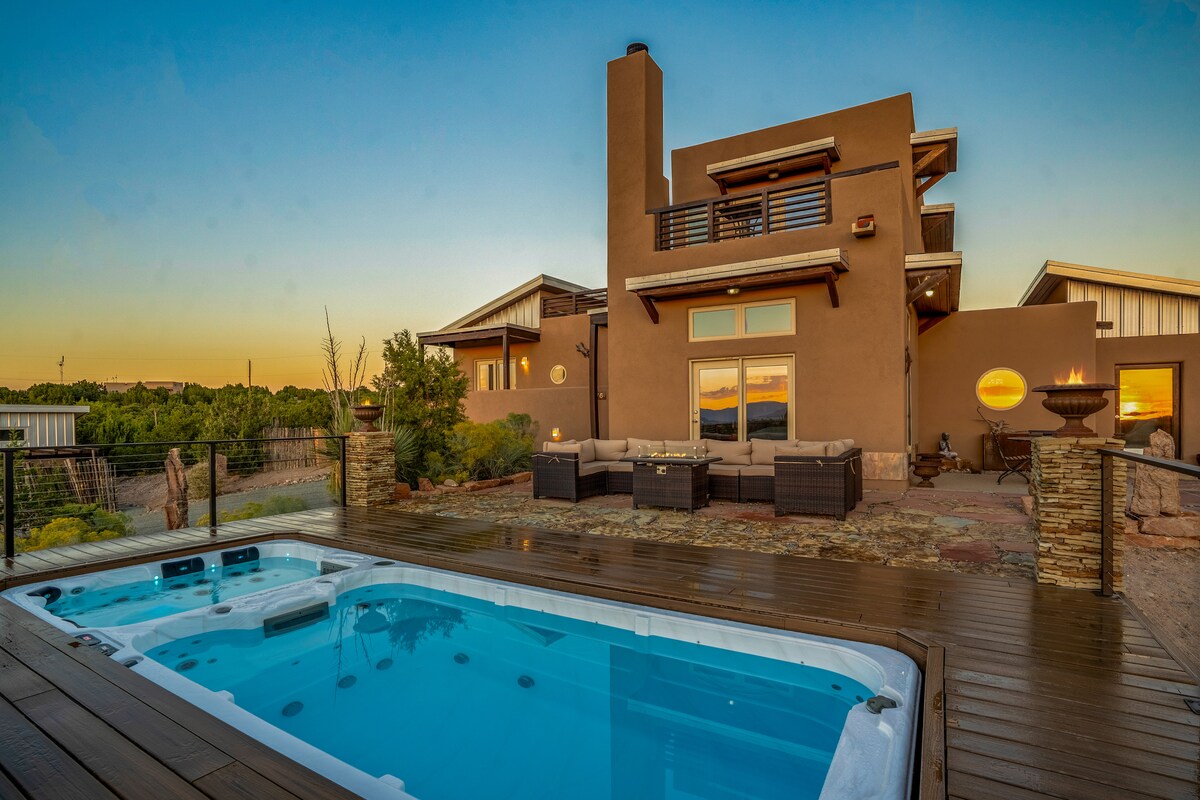 Casa de Luxx: Two Bedroom Wing is a private section of the house with its own entrance located between the Plaza & Meow Wolf. Hot tub, a sauna, and a pool open year round. Includes two comfortable bedrooms, bathroom, office, kitchenette, fire pit & patio. Peaceful with beautiful views. This wing does NOT include a full kitchen, living room, kitchen sink, or sofa. For these, book Casa de Luxx or Casita de Luxx. Tesla/EV charger.
