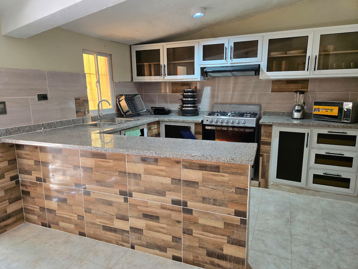 Casa remodelada con portón automático. Calentador de agua nuevo, lavadora y secadora, Smart TV, aire acondicionado en cada habitación. Amplio patio privado con muebles de exterior, mesa de dominó, hamaca y sombrilla, ideal para recibir visitas. Internet de alta velocidad, inversor de batería para proporcionar energía las 24 horas para pequeños electrodomésticos en caso de corte de luz. Gran cisterna subterránea para agua, cerradura electrónica para un fácil acceso. Ubicada en una zona segura.