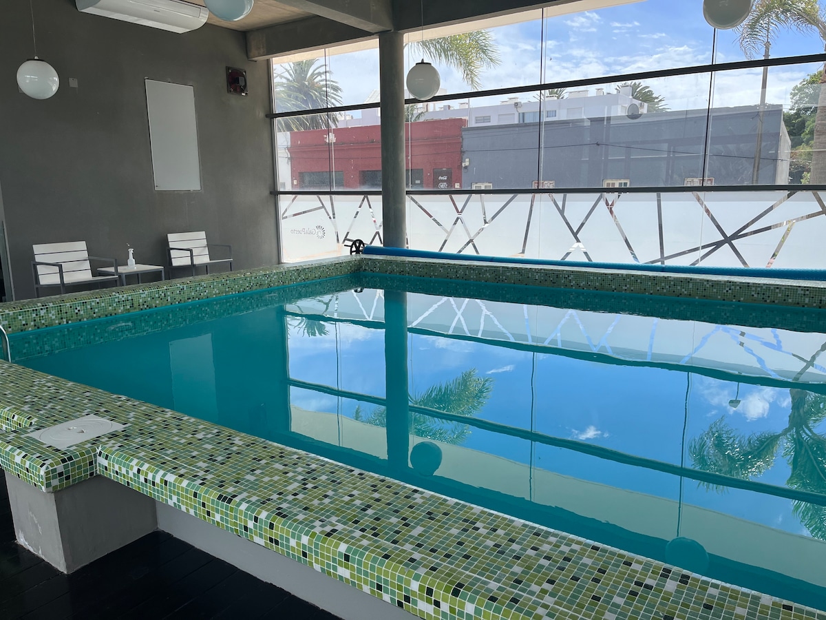Edificio de diseño, moderno y funcional con una ubicación estratégica a mts del puerto, bares, cafés y mejores restaurantes. Amenities : fitness y spa (Gym, sauna y piscina interior climatizada), piscina exterior y solárium con imponente vista a la península, 3 bbq equipadas, laundry, cochera privada. El apto cuenta con cocina completa, mesa, sillas y sofá cama. Área de dormitorio con placard, cama queen y TV led. Ropa blanca incluida. Terraza balcón con juego de living exterior. Wifi y Cable.