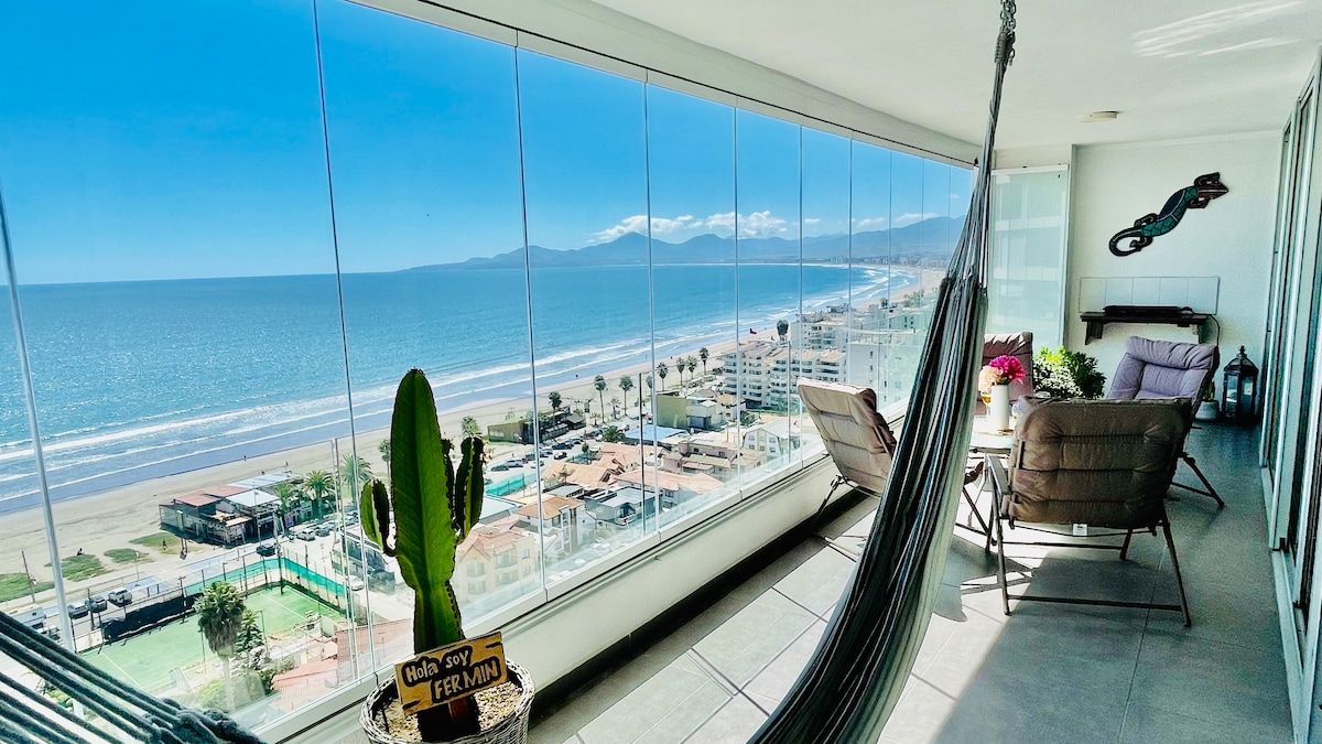 Escapate frente al mar con tu familia. En cualquier época del año, sientete como si estuvieras en tu hogar. Atardeceres desde la terraza, donde se ve toda la bahía de coquimbo y la serena. En las noches cielos despejados y estrellados, respirando el aire marino. Todo esto frente del mar, piso 19, para 5 personas. A un costado del casino Enjoy. piscina al aire libre y vista al infinito. Kinchos Con vista panoramica. Estacionamiento gratis. Saliendo del condominio avenida costanera
