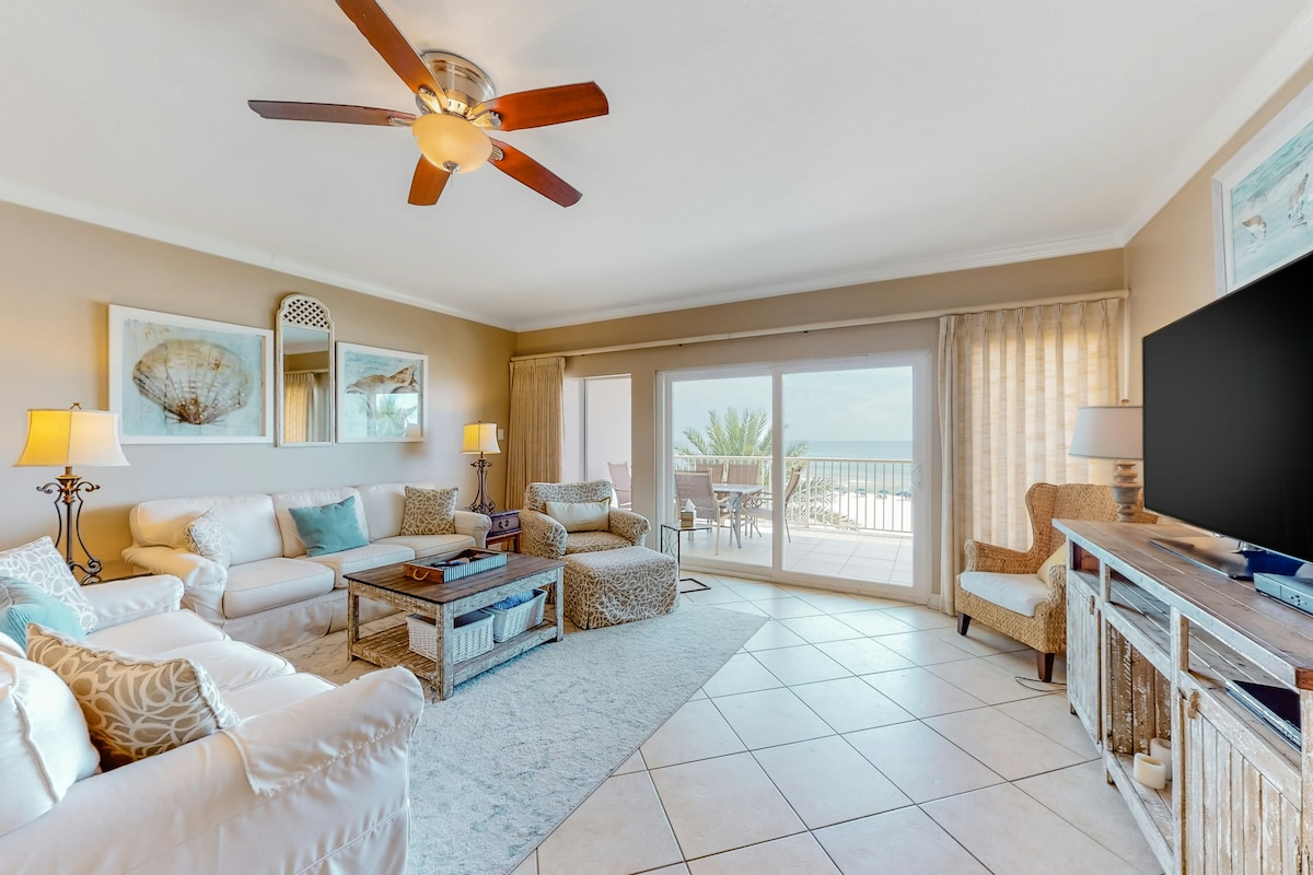 Despiértese con el sonido de las olas y las vistas infinitas del golfo en este luminoso condominio de 2 dormitorios y 2 baños situado en primera línea de playa. Salga a su balcón privado cada mañana con una taza de café y observe cómo la luz del sol baila sobre el agua. Cuando esté listo/a para empezar el día, salga directamente a la playa y deje que las olas se lleven sus preocupaciones. Después de un día de playa bien aprovechado, refrésquese en la piscina comunitaria o relájese en la sala de estar de concepto abierto, donde la comodidad se combina con el encanto costero. Prepare su comida favorita en la cocina totalmente equipada y disfrute de una noche tranquila con el sonido de las olas como telón de fondo. Esta joya frente al golfo es el tipo de lugar que te hace bajar el ritmo y respirar un poco más profundamente. Ya sea que venga para una escapada romántica o para unas vacaciones en familia, encontrará todo lo que necesita para disfrutar de una estancia relajada y soleada. Aviso legal: El estacionamiento no está incluido y debe ser pagado por el huésped. El costo es de $65 por pase de estacionamiento. Los huéspedes recibirán un correo electrónico con instrucciones para comprar su pase de estacionamiento antes del check-in.