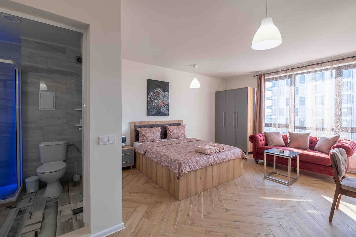 Entire one-room apartment situated in modern building. Airconditioned. Floor heating in winter for exceptional comfort. Wide modern bathroom. Direct connection with the Airport via Metro and then 8-10 min. walk straight or 1 stop with the tram. Direct connection with Central Bus/Railway Station. The city center is in a walkable distance or 12 min. using the public transport if you prefer. The tram/bus stop is in front of the house. Mall of Sofia and SPA/swimming pool complex near. Food shop.