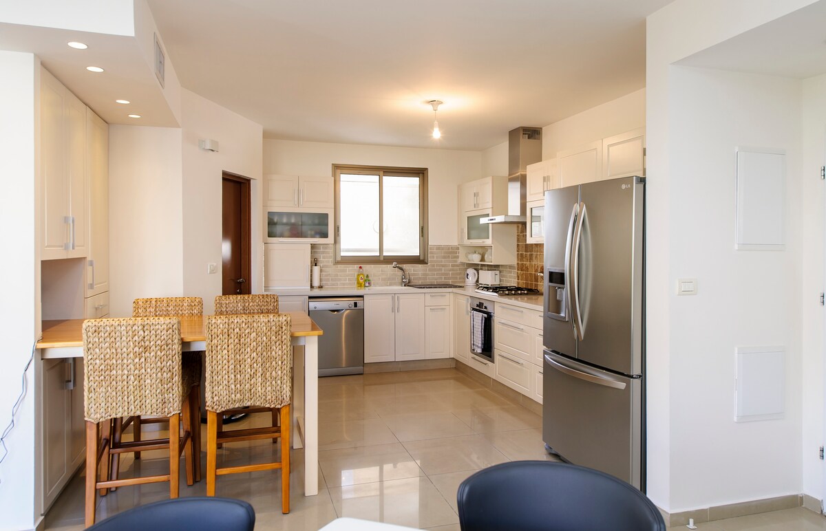 Enorme villa cerca de Tel Aviv y playas de arena. A solo 20 minutos en coche de Tel Aviv y Herzliya, y a 50 de Jerusalén. 300 m de espacio habitable, 3 plantas con 2 balcones, enorme cocina preciosa, totalmente climatizada, piano. 2 grandes jardines con árboles frutales, gran cama elástica. Wifi óptico -1000 mb. Hay un refugio subterráneo (Miklat) en el sótano de la casa. Un supermercado y una piscina a poca distancia. ¡Nos encanta nuestro hermoso hogar y haremos todo lo posible para que tu estancia aquí sea perfecta!
