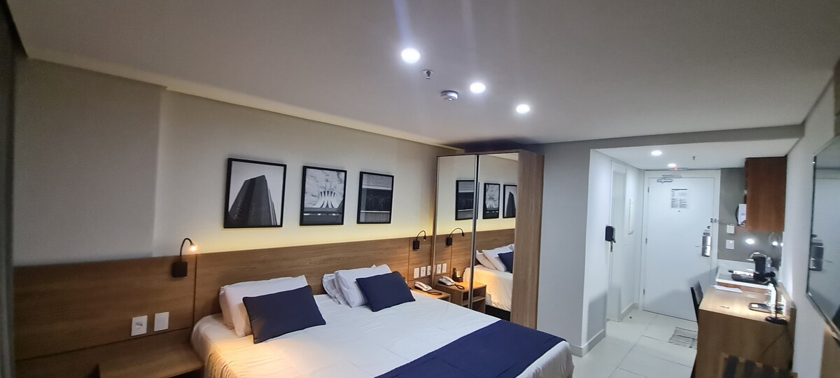 Apartamento suíte completa com ar-condicionado, chuveiro com aquecimento central, mini cozinha, vista para a reserva. Wi-Fi gratuito, TV smart, a cabo e itnernet, Youtube etc. O espaço não precisa de um detector todos os aparelhos são elétricos (incluindo aquecedores de água), e não há lareira ou garagem anexa. O Flat - Pau Brasil dispõe de estacionamento gratuito, recepção 24 horas. No local piscinas ao ar livre aquecidas e não aquecida, sauna, academia, spa, bar, restaurante etc.