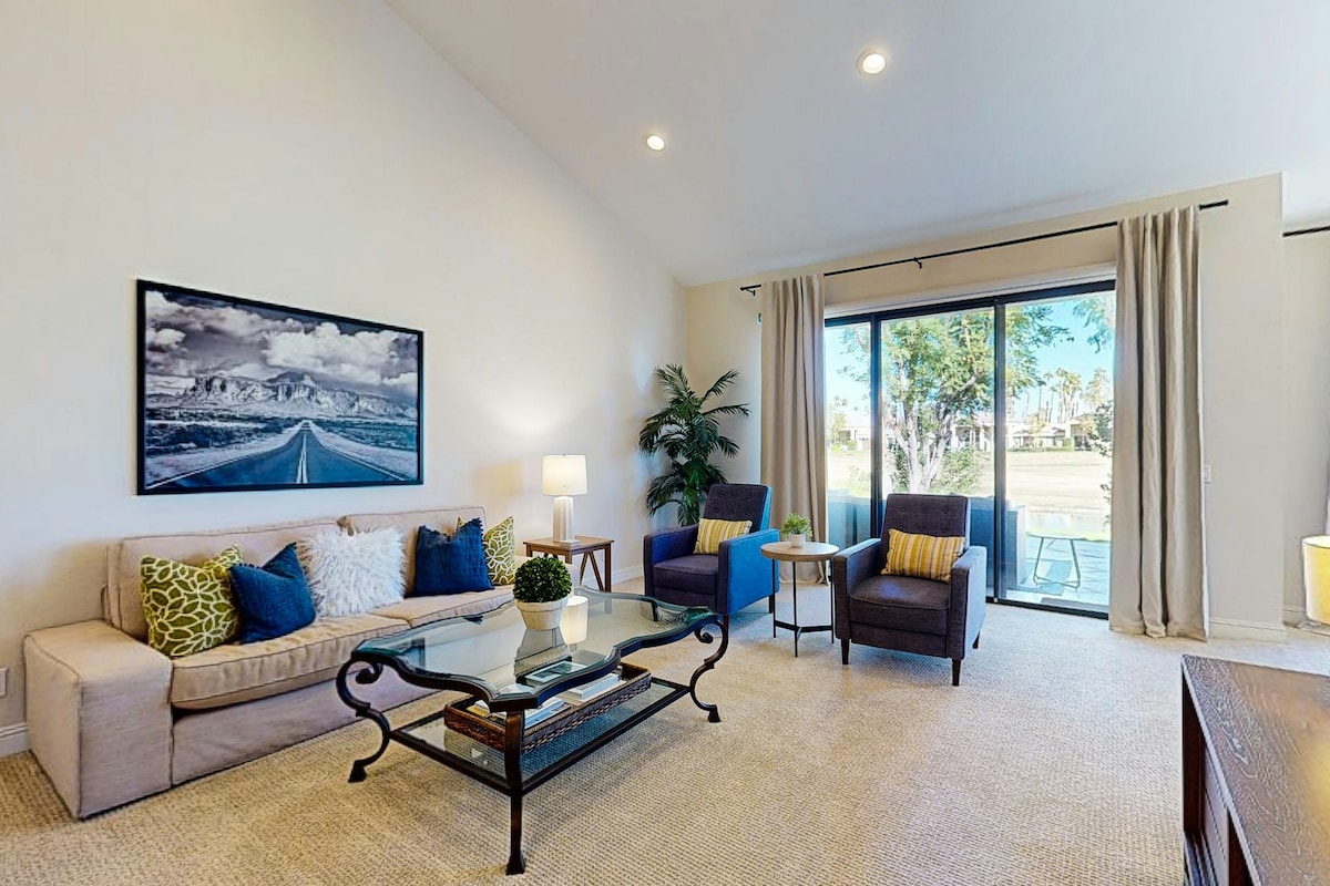 Beautifully decorated and well appointed single level Palm Desert townhome, close to the freeway, La Quinta, Rancho Mirage, and Indian Wells, 4 miles to BNP Paribas Open, with a Coachella/Stagecoach shuttle pick up only 2 miles away. Located on a gorgeous greenbelt between holes 5 and 8 of the Palm Desert Resort Country Club, with a pool & spa just steps out the back. Convenient to everything!