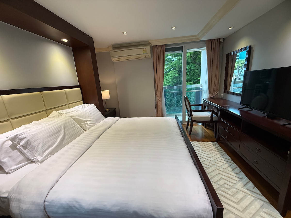 Este apartamento extragrande de lujo con servicios de 3 dormitorios se encuentra en el corazón de Sukhumvit Soi 11, la calle más emocionante de Bangkok para la vida nocturna, los restaurantes y los bares en la azotea. Amplio y elegante, combina la privacidad de un alojamiento con la calidad y el servicio de un hotel boutique. Disfruta de limpieza diario, servicio de habitaciones, servicio de conserjería y acceso a una piscina en la azotea y gimnasio las 24 horas. Está a solo 5–10 minutos de Nana BTS, 7/11, un supermercado internacional y excelente comida callejera.