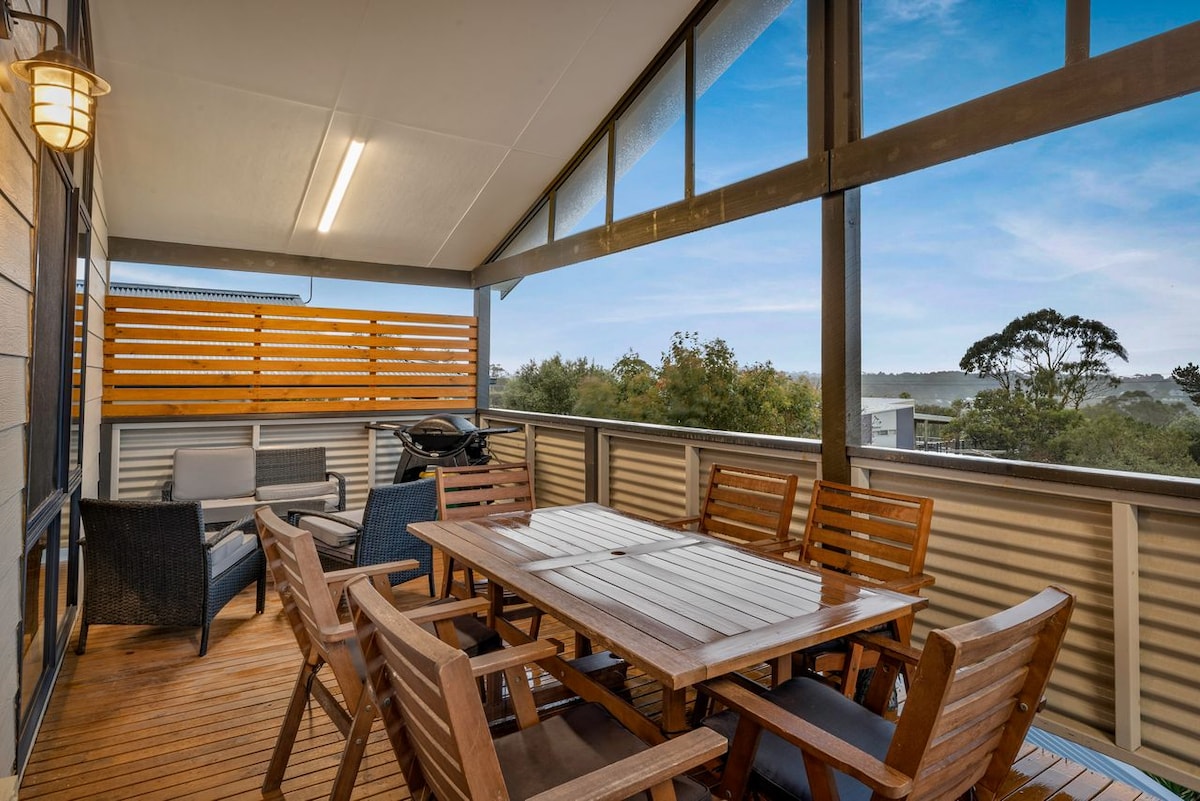 Relaxed Foreshore Beach House Tucked at the end of a quiet cul-de-sac this foreshore hideaway is made for barefoot holidays. Wander to rock pools, play on the lawn, watch wallabies graze and kookaburras laugh in the trees or gather on the deck as the BBQ sizzles and waves roll in. Inside, two living areas give families space to spread out while cosy bedrooms invite slow mornings with sea views. A fully equipped kitchen makes longer stays and entertaining a breeze your island home away from home