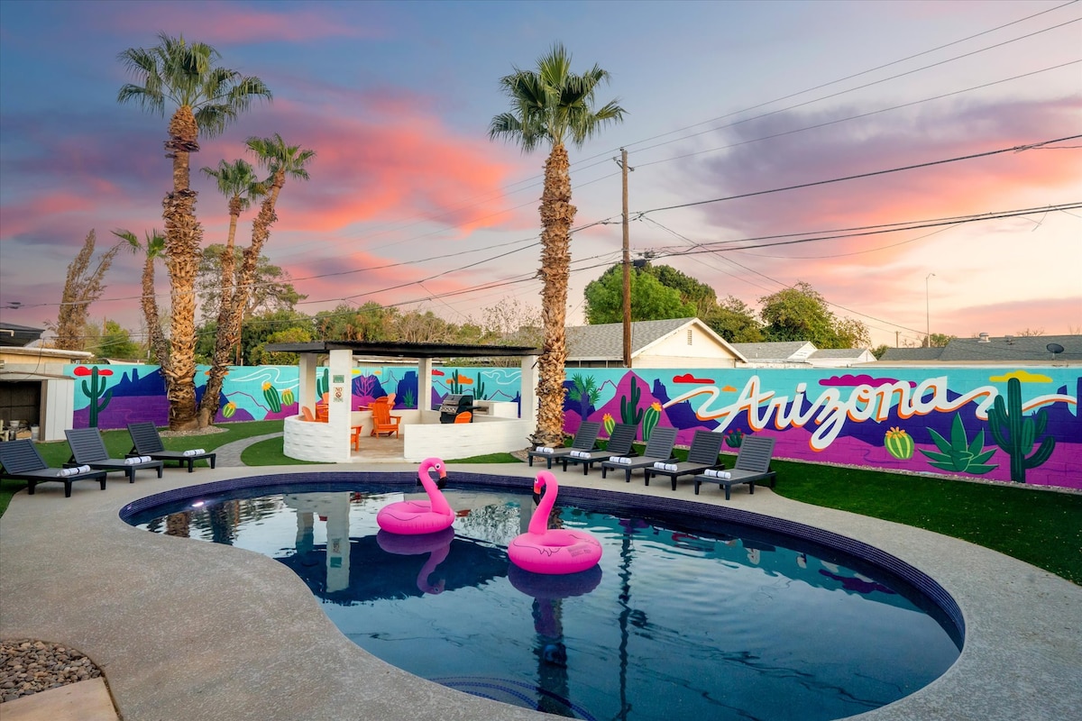 Oasis de palmeras de mediados de siglo moderno de estilo Frank Lloyd Wright de los años 50 en el casco antiguo de Scottsdale con piscina privada y jacuzzi. Se admiten perros. Internet Gigablast. Creemos que las mascotas son parte de tu familia, ¡tráelas! Salón interior/exterior con cama tamaño king, patio cubierto, ventanas enormes y vistas a la montaña Camelback. Todo con un ambiente de cultura pop. A 3 manzanas de senderos de canales para relajarse en el desierto dando un paseo. A 1 manzana del tranvía gratuito. Camina/ve en bicicleta al Desert Botanical Gardens y al Phoenix Zoo.