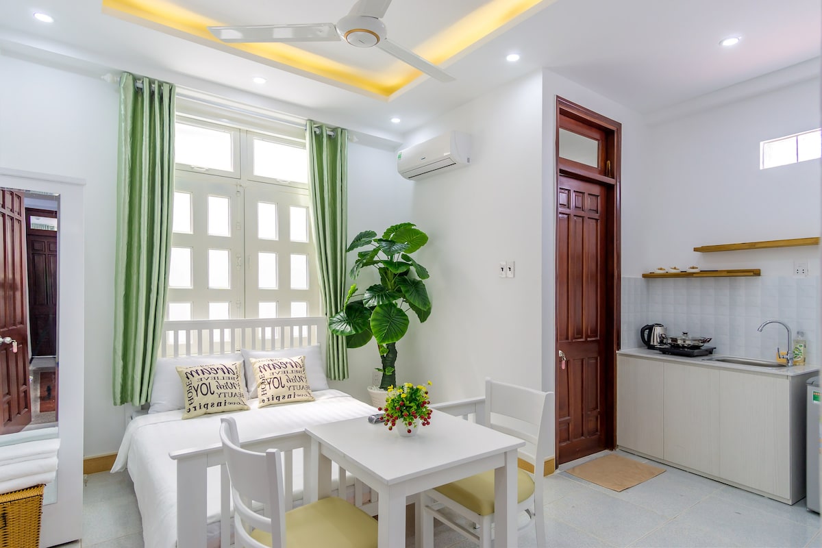 Vietnamese-Mediterranean Studio in central: • 2 km to Tan Son Nhat Airport & Phan Xich Long food street • 3 km to District 1 & major attractions, 4 km to Notre-Dame Cathedral Surrounded by popular Vietnamese eateries • Spacious bed (up to 3 guests) • Modern bathroom with bathtub & toiletries • Parking for cars & motorbikes • Café downstairs & photogenic corners • Projector, water purifier, coffee machine Enjoy thoughtful hospitality blending international touches with classic Vietnamese charm.