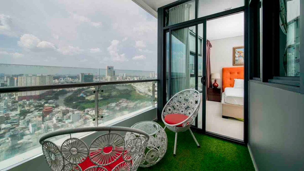 This unique place is designed for a luxury-in-style experience. With a smart sliding door, your living room and bed room are easy connected to maximize spacious 50m2 house. Walking on the BaSon bridge between the condo and D1, you can feel the breeze of Saigon river and spectacular view of the city. By just 5 to 10 min on cab, you can get to city center.