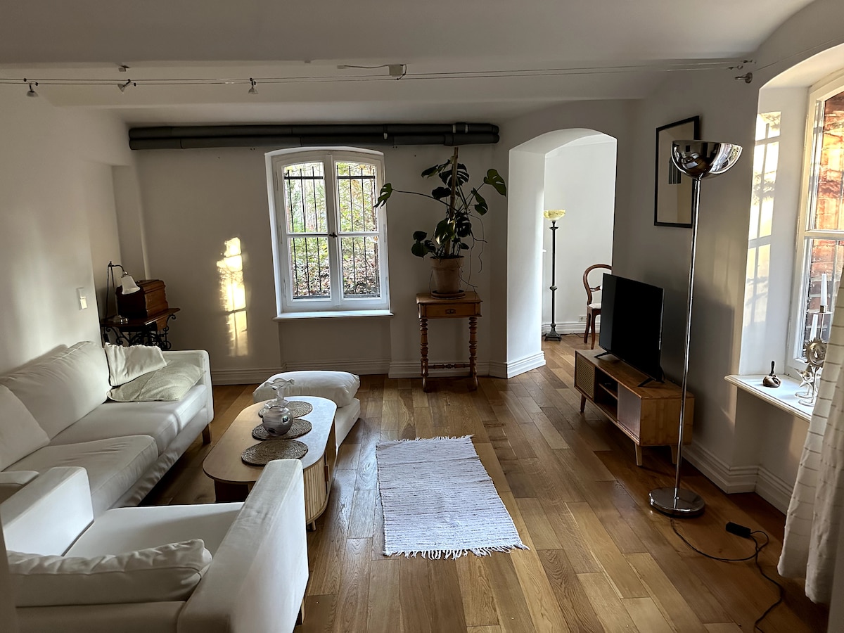 Este lugar especial tiene su propio estilo con una mezcla de muebles modernos y antiguos, una cocina totalmente equipada, un baño con bañera de esquina y luz natural, una barra de ballet con grandes espejos, una cúrcuma, calefacción por suelo radiante en toda la zona del apartamento y una chimenea para horas acogedoras.