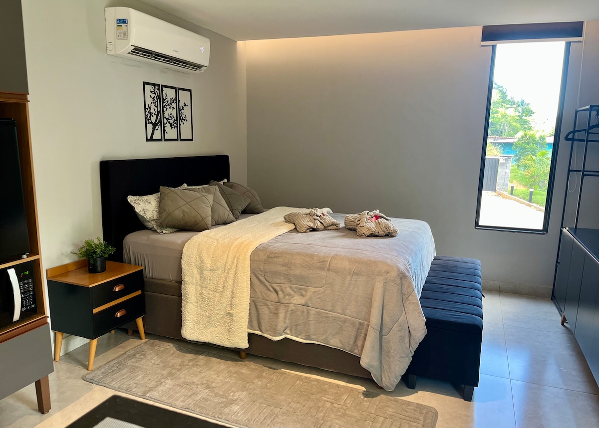 Away Cabanas: en PIEDRA AZUL, a 5 minutos de la Ruta del Lagarto. Tiene una puerta automática única que se abre por control remoto. ¡Fácil acceso (buena carretera), wifi confiable y rápido, vista y PRIVACIDAD! Cubierta con la caja colgante perfecta para relajarse. Cocina completa, cama tamaño queen, ropa de cama y toallas incluidas. Aire acondicionado con función DE CALEFACCIÓN disponible. Decoración inspirada en la ciudad de Chamonix en Francia. LA MISMA CARRETERA DEL HOTEL AROSO. A 2 km del supermercado, las cervecerías y Pedra Azul.