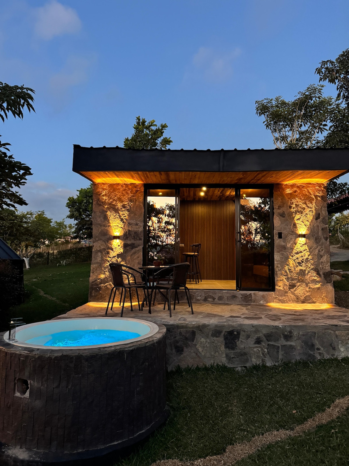 A escasos 50 minutos de Bucaramanga, te garantizamos un lugar amplio y tranquilo, para disfrutar de una noche contemplando las estrellas y un amanecer con la hermosa vista del Cañón del Chicamocha. En nuestro alojamiento además de tu cabaña encuentras una sala amplia hecha de bambú que evoca los mambeaderos usados por nuestros indígenas, un jacuzzi natural frente a la montaña, un pozo con tres espejos de agua para gozar de su sonido y un mirador. Todo esto te permiten descansar y desconectarte.