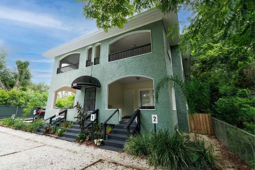 This second-floor carriage house is all yours. Located on a quiet street amidst historic homes. Walk to Stetson in 5 min. Downtown DeLand is an easy 15 min. walk. Your two bedrooms, full kitchen, private access will be great for a get-away for you and your guests. 42" flatscreen TV with cable and Amazon Prime with no ads. Wifi. The second-story banks of windows look out over beautiful, tropical plants. Space to work or relax. We look forward to you enjoying your stay with us.