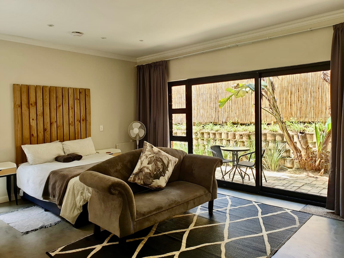 Open plan groundfloor unit with king bed or twin single beds, lounge with log fireplace, dining, kitchen area. Bathroom en-suite is shower only. Pet-friendly (see pet fees.) Option to convert to a family 4-sleeper with an adjacent double unit. Big Studio offers electric blankets, wallfan, hairdryer, tea-tray, free WiFi over fibre, ironing facility, Netflix, StayBasic Dstv available by prior request, or bring your HDMI cable for own streaming. We offer full bouquet Dstv in the main guestlounge.