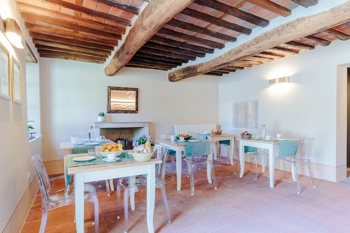 Casa Dolce Acqua is a welcoming and traditional Tuscan farmhouse located within a residential park with rural charm immersed in a context of greenery and tranquility. The house retains the traditional appearance of old country houses with local stone walls and ceilings with wooden beams and mezzane that add a rustic and authentic charm. The interiors are warm and welcoming with wooden doors and furnishings and a stone fireplace that recall the simple and refined Tuscan style.