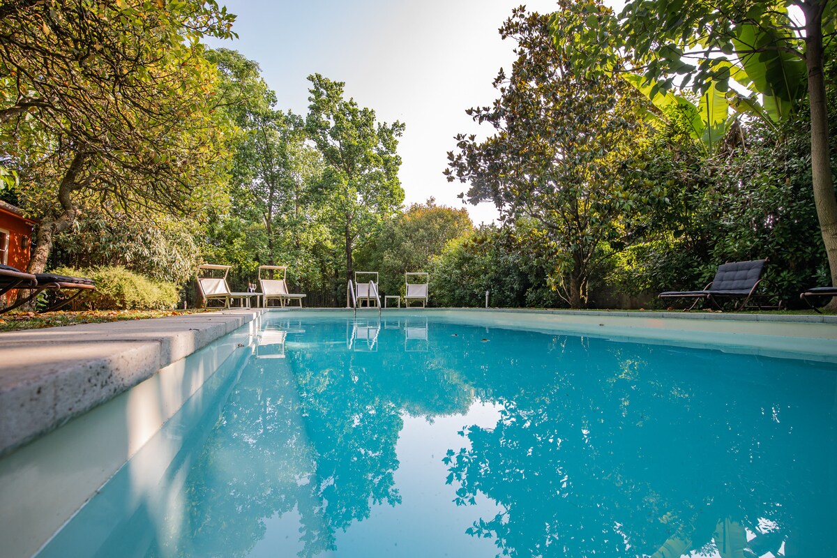 A tres kilómetros de las murallas de Lucca, villa Art Nouveau fielmente renovada manteniendo el encanto original, con frescos de época y equipada con comodidades modernas, rodeada de vegetación, con un gran parque con una piscina climatizada en el centro, todo vallado con estacionamiento interno, muy adecuado para niños. Zona tranquila para paseos, paseos en bicicleta al centro histórico de Lucca y para llegar a la hermosa Ville Nobiliari Lucchesi 1500 y la autopista a Florencia y el mar.