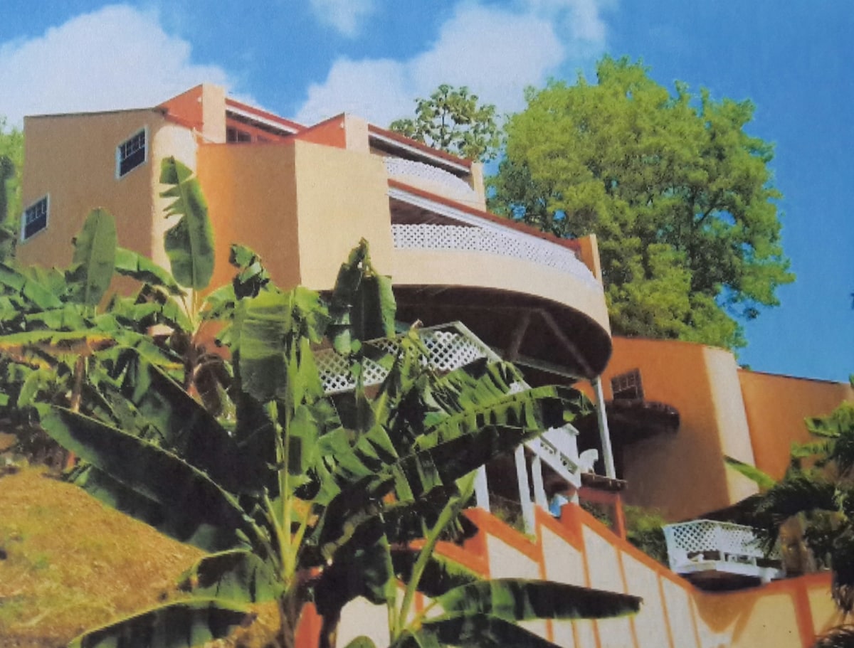 Esta villa en la cima de una colina es brisa y está bien equipada, con una gran vista al Atlántico. Está al lado de la casa del anfitrión en grandes terrenos seguros, lejos del ruido del tráfico, pero a poca distancia en auto de las playas populares, el Parque Nacional Pigeon Island y los centros comerciales de Rodney Bay. Nota: esta estancia tiene 3 perros grandes y amistosos [pix en el anuncio] y no es adecuada para huéspedes a los que no les gusten los perros o que no puedan aceptar sus ladridos como una compensación razonable por la seguridad adicional que proporciona el coro canino.