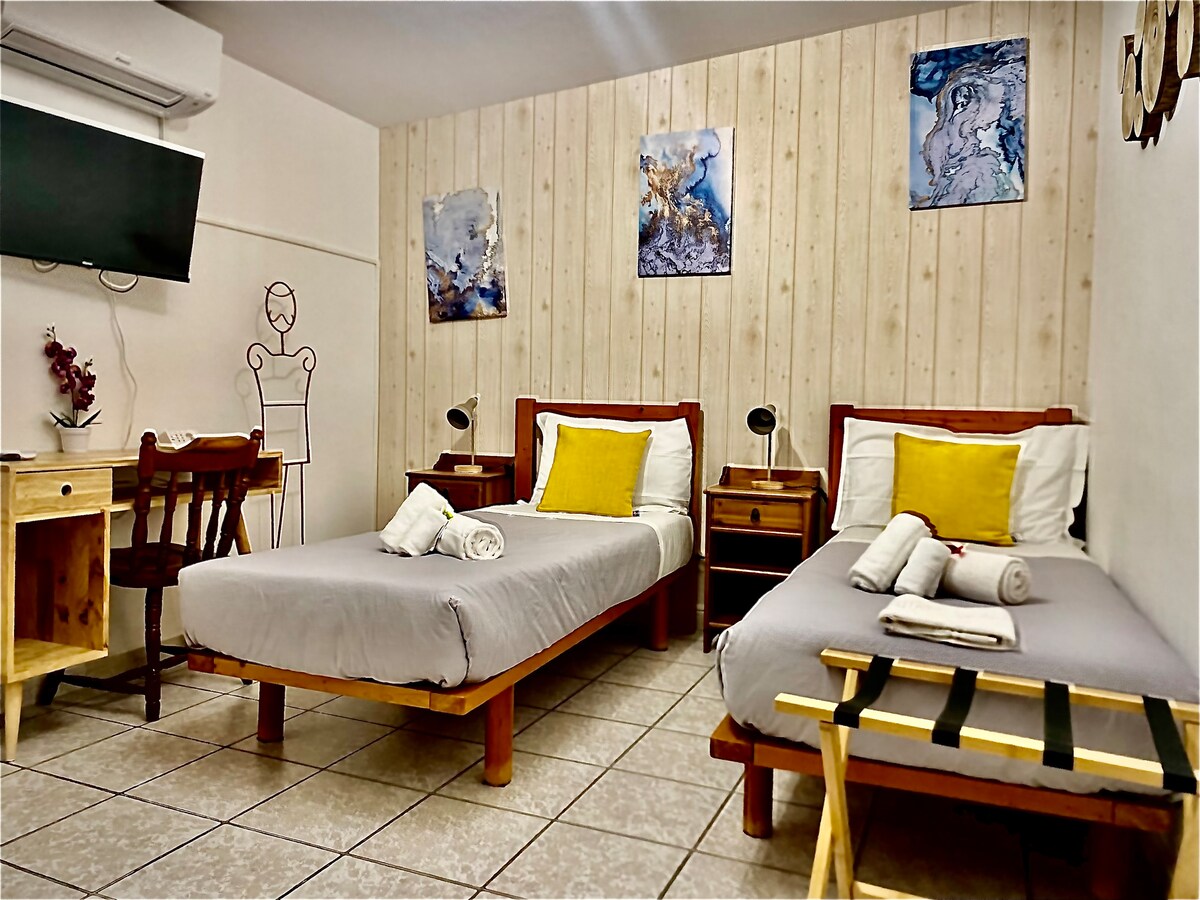 La suite está equipada con wifi, TV, aire acondicionado, cocina americana y baño con ducha. En cada habitación encontrarás una bandeja con porciones selladas de mermeladas, Nutella, galletas, biscotes, cápsulas de café y bebidas calientes para consumir de forma independiente con la máquina «Nescafè», hervidor para té y plato para tostadas. Para que tengas total autonomía durante tu estancia, la llave de la habitación está en la caja de llaves junto a la puerta.