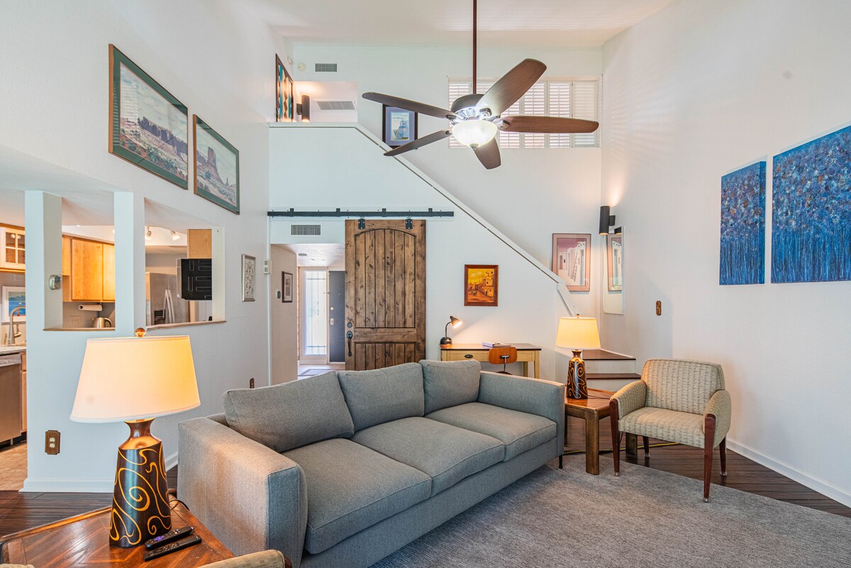 Precioso condominio en el corazón de Tempe. Los colores vibrantes con excelentes vistas en un balcón privado, dan a este acogedor espacio de estar una sensación de lujo. Smart TV de 75 pulgadas en la sala de estar y TV inteligente de 55 pulgadas para el dormitorio, ambos equipados con Netflix, Disney + y Hulu. Starbucks está a 5 minutos a pie y Mill Ave está a menos de una milla de la unidad (a unos 25 minutos a pie). Piscina/bañera de hidromasaje/gimnasio, cocina lista para cocinar, chimenea eléctrica y lavadora/secadora, todo en la unidad. Número de registro estatal: 21381417
