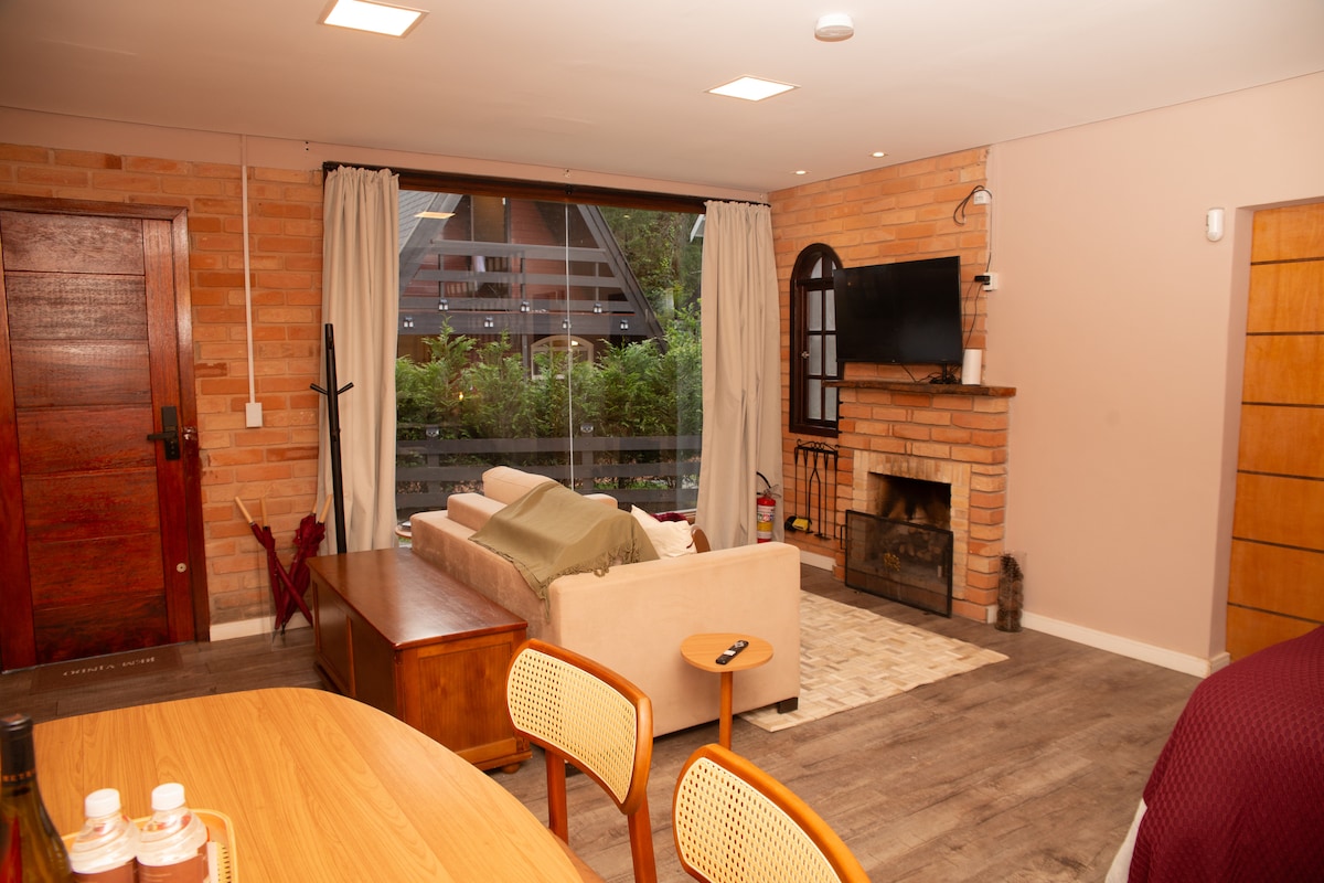 Chalé cristal muito perto do centro . banheira com cromoterapia Em um lugar cercado de natureza , muito aconchegante, tranquilo é muito reservado Cama de casal tamanho padrão Com roupa de cama , travesseiro , coberto e toalhas Todos os utensílios de cozinha talher ,sanduicheira ,liquidificador,cafeteira e panela de fondue , ar condicionado apenas para o calor não é liberado função aquecimento para isso temos lareira.fornecemos roupão mediante a pedidos antecipados e pagamento de 40 reais