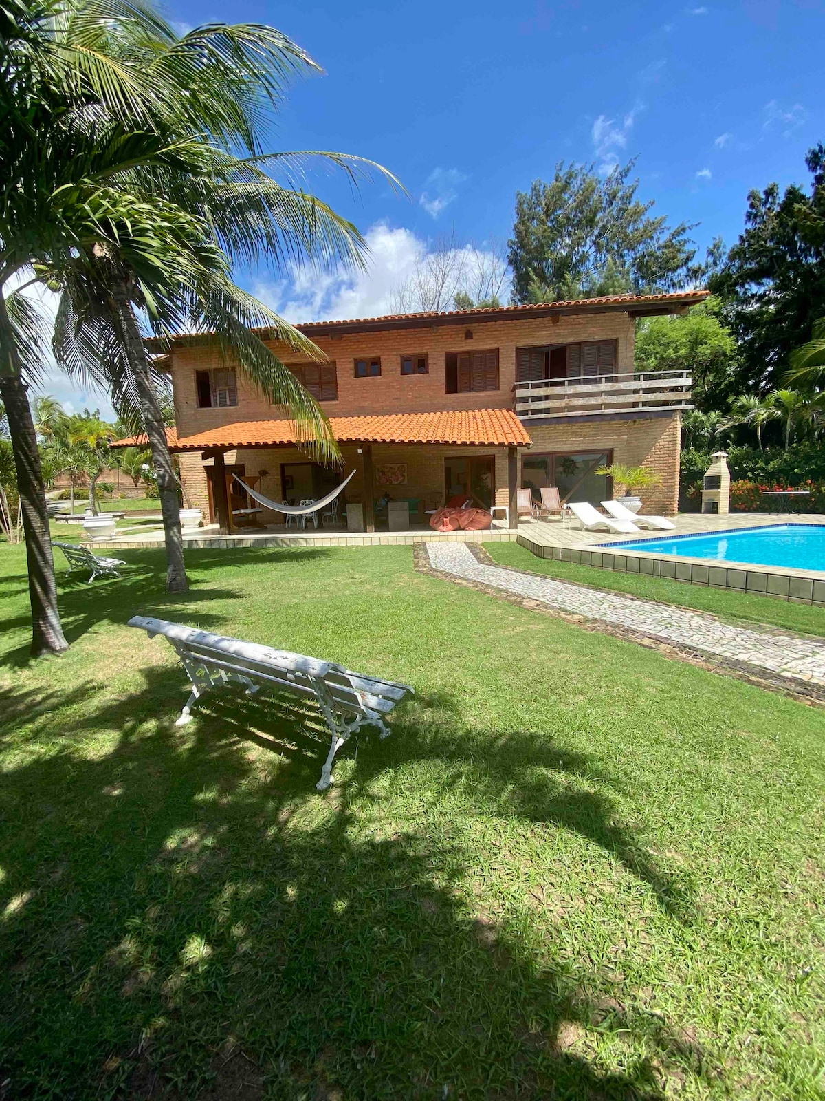 Gran lugar para descansar y relajarse. Acogedora casa dúplex, con 200m² de superficie construida, 900 metros de superficie total, amplio espacio exterior, piscina, terraza con barbacoa, jardines, césped y balcones. Se encuentra a menos de una cuadra de la playa, ubicación céntrica, cerca de los Hoteles Donana, Jangadeiro, Pousada do Sol y el mercado “Mangue Seco”. Tiene 4 dormitorios, 3 de los cuales son suites. Nota: ¡tiene Wifi! *Está a 50 minutos del aeropuerto Pinto Martins y a 60 minutos de Aldeota.