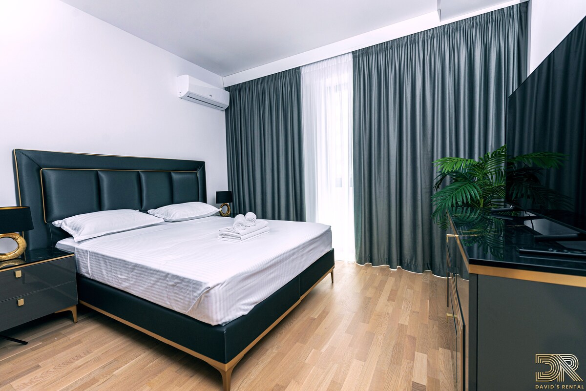 Enjoy a stylish experience at this centrally located residence in Militari Residence. This apartment features the following amenities: Private parking with a barrier Walls decorated with Stucco Veneziano 4K Smart TV with Netflix and Air conditioning The complex offers: indoor and outdoor pools, wet and dry saunas, jacuzzi, and a fitness center. The distance to the Wellness center is 500m, and to Aqua Garden it's 550m, approximately a 7-minute walk. The price for pool access is 70 RON per person.