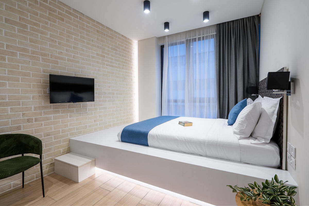 Elegant, modern apartment in Monastiraki, Athens' most central neighborhood. Located merely 300 meters from the Monastiraki subway station, our space offers brand-new hotel design with luxurious finishes. Ideal for a comfortable and memorable stay for a few days, weeks or even months, it beckons you to experience a stylish immersion into the very heart of Athens. Breathing new life into a mid-century textile manufacture, our building’s façade and overall architecture serves as a constant visual