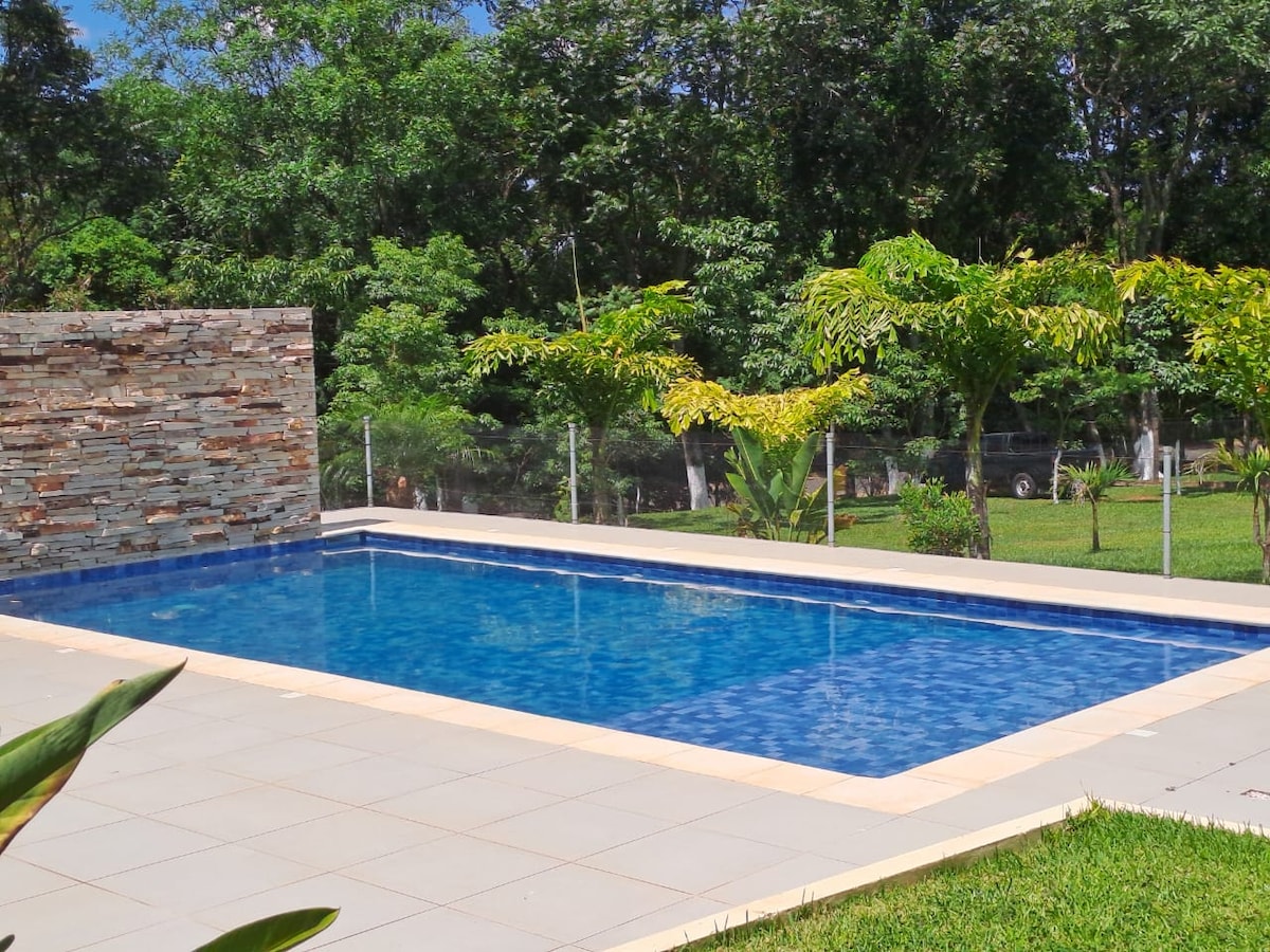 Disfruta de una casa tranquila con piscina y jardín grande en Piribebuy, Barrio Jakarey, rodeada de vegetación, a unos 6 km del centro de Piribebuy. Dos dormitorios y un sofá cama para familias y parejas. Cocina, baño, wifi, terraza y estacionamiento aseguran días cómodos y relajantes en la naturaleza.