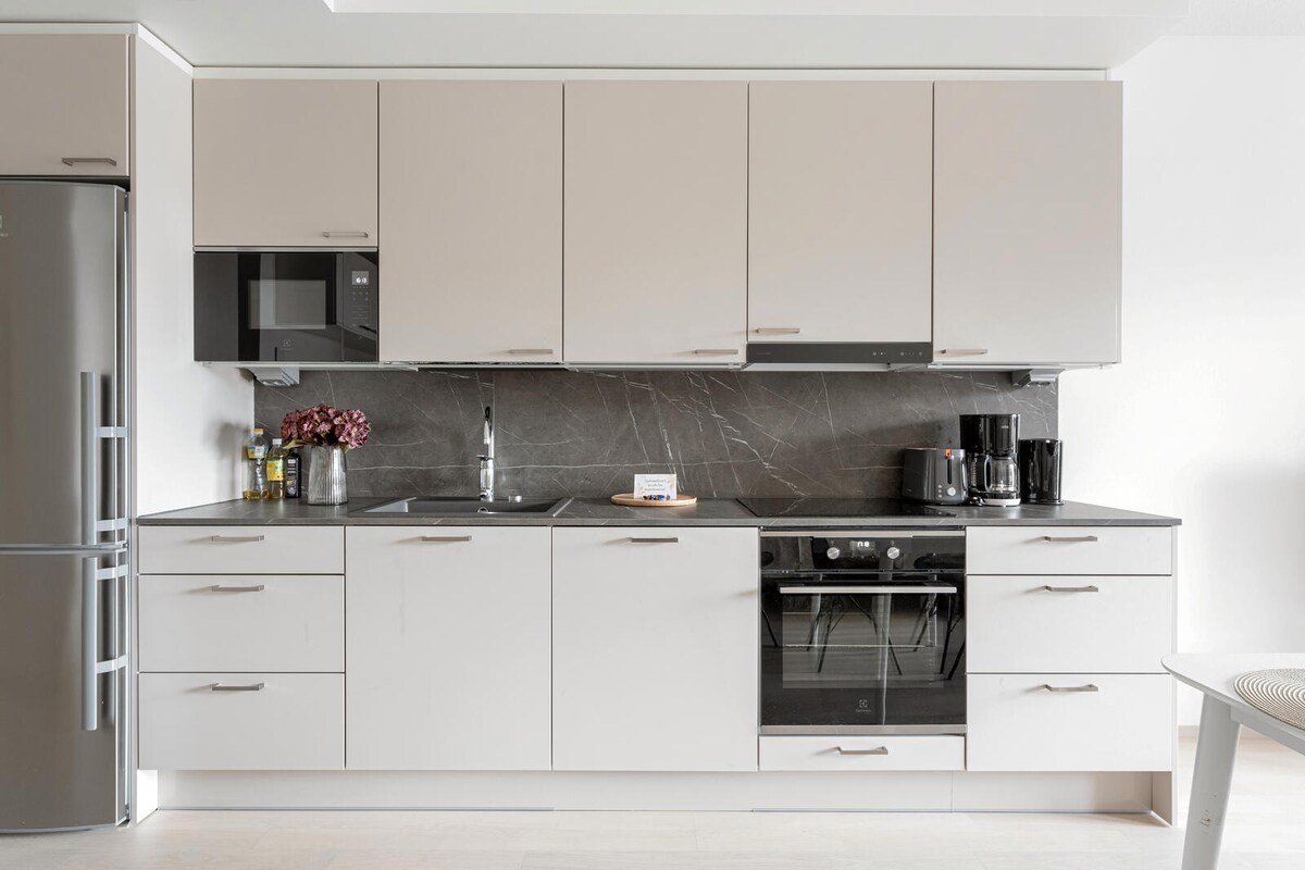 Cozy air-conditioned 74.5 m2 2BR apartment with sauna in Tammela Stadium. With elevator you can access parking hall, supermarket and restaurants. The apartment has high-quality materials and equipment and 65" TV with Netflix, as well as a large balcony (20m2) with park view. There is 1 free parking spot in the parking hall and public transport is just around the corner. City center is also nearby (1km). This place is good for business travel or for relaxing break from everyday life.
