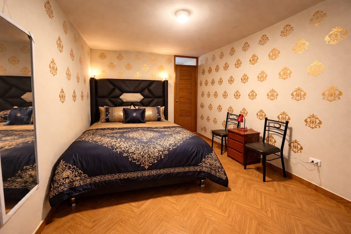 Habitación con cama king, baño y cocina americana a 350 m de la plaza principal