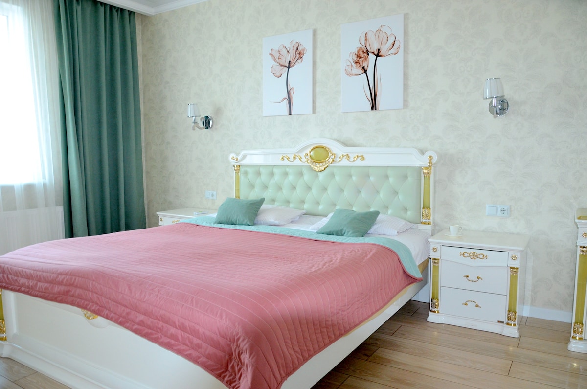 Nosotros, Victoria y Constantine, te invitamos a visitarte! Mi marido y yo hemos viajado mucho, así que sabemos cómo sentirnos bien en casa, estés donde estés. Intentamos que el apartamento fuera lo más acogedor y cómodo posible para nuestros huéspedes. El apartamento está en un edificio de un moderno y limpio complejo residencial «Golden Era». En el territorio hay aparcamiento gratuito para huéspedes, una tienda, parques infantiles, un campo de entrenamiento para adultos. La playa más cercana está a 1,3 km (15 min x a pie o a 5 minutos en coche). ¡Bienvenido!