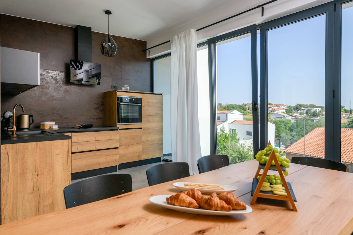 Prostor je uređen u modernom rustikalnom stilu, inspiriran tradicionalnim istarskim konobama, s pažljivo odabranim detaljima koji stvaraju toplu i ugodnu atmosferu. Kombinacija prirodnih materijala, drva i kamena, uz moderne elemente uređenja, stvara skladan prostor u kojem se gosti mogu osjećati opušteno i ugodno tijekom cijelog boravka. Smještaj je idealan za parove, ali i za solo putnike koji žele uživati u autentičnom ambijentu i mirnom okruženju, daleko od gradske buke, a opet blizu grada.