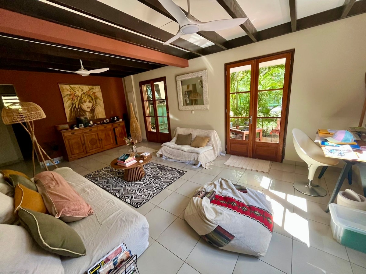 Mi bungalow, independiente y totalmente equipado, se encuentra en un gran jardín tropical que compartiremos con mis perros, Nina y Gastón, muy cerca de la laguna de la ermita. Su terraza y sus 3 paneles correderos permiten modular el espacio a su gusto. Le gustará especialmente su ducha exterior al volver de la playa. En el barrio, podrá desplazarse a pie para llegar a los restaurantes, tiendas o al mercado de la ermita. Es perfecto para 1 o 2 personas.