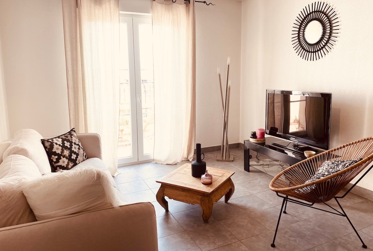 En una residencia de lujo reciente, muy bonito apartamento para 4 personas totalmente equipado (wifi),con su zona de cocina, su salón comedor (sofá cama de 160) un dormitorio con cama de 160 y un baño, su terraza con muebles de jardín y tumbona con vistas a la montaña y los pueblos,garaje privado. Residencia tranquila, situada a 200 metros de todos los comercios y de la playa de arena fina Disfrute del excepcional mercado de pescado todos los días.