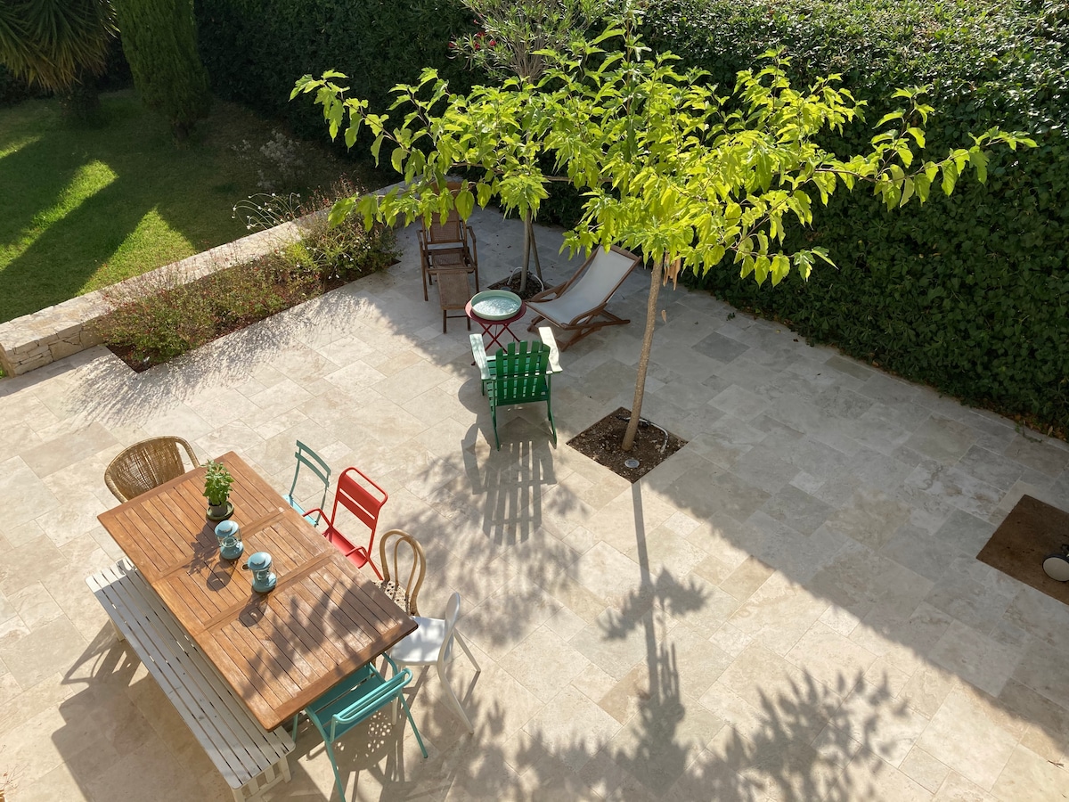 Te alojarás en la dependencia de la Bastide, en una planta, rodeado de un magnífico jardín mediterráneo de 3000 m2. Te beneficiarás de una gran terraza con vistas despejadas a la exuberante vegetación: alcornoques, palmeras, madroños, yucas, etc. Paz y tranquilidad garantizadas para disfrutar del sol o almorzar bajo la pérgola. Las habitaciones tienen aire acondicionado.