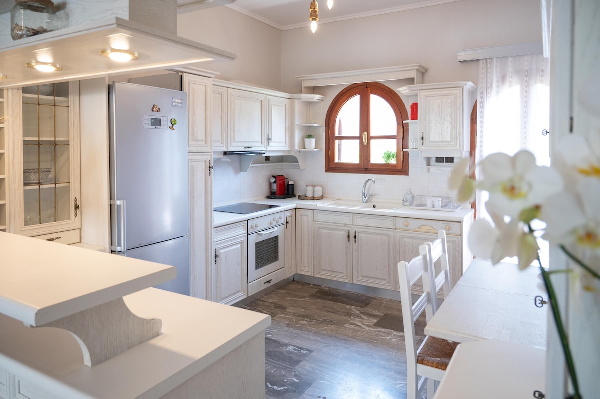 Casa Rizzato cuenta con la aprobación de la Organización Griega de Turismo y es administrada por «Etouri Vacation Rental Management». Ubicada a solo 150 metros de la extensa playa de arena de Platania y a poca distancia a pie de todos los servicios de la zona, esta villa de tres dormitorios, magníficamente renovada, combina la comodidad moderna con una ubicación inmejorable. Diseñada pensando en el estilo y la funcionalidad, puede alojar cómodamente a seis huéspedes, con la opción de recibir hasta nueve si es necesario.