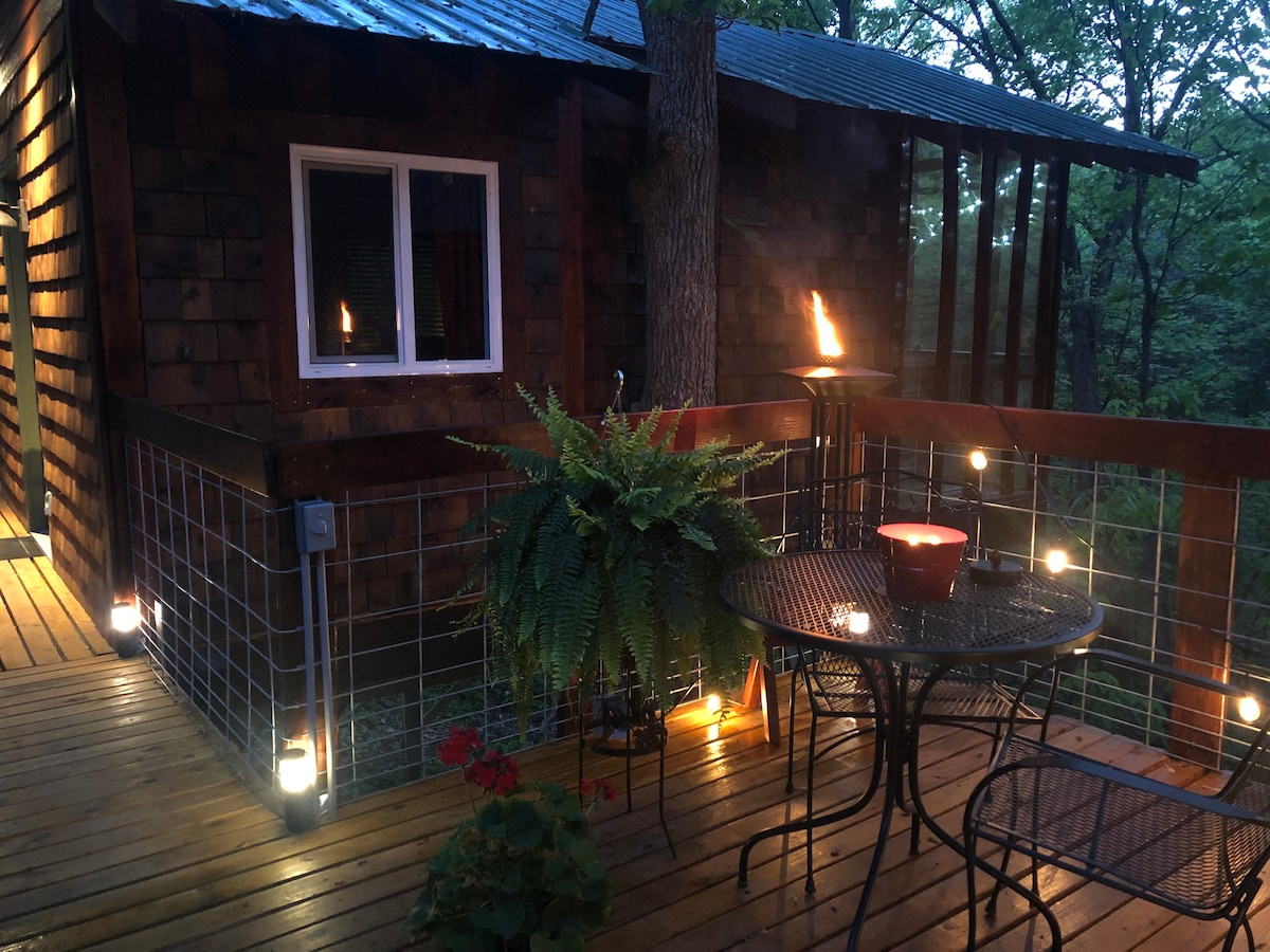 Casa mágica en un árbol enclavada entre robles en nuestro hermoso rancho de 200 acres estilo parque nacional, bordeado de hermosas rocas de piedra caliza que rodean un lago privado de 15 acres alimentado por manantiales con sala de estar al aire libre y playa de arena. Ideal para nadar, hacer kayak, surf de remo y excelente para pescar. Estamos a 5 minutos del centro de Excelsior Springs, del campo de golf Excelsior Springs y del aeropuerto municipal 3EX. Vivimos en el lugar y generalmente estaremos disponibles durante toda tu estancia si lo necesitas o lo deseas.