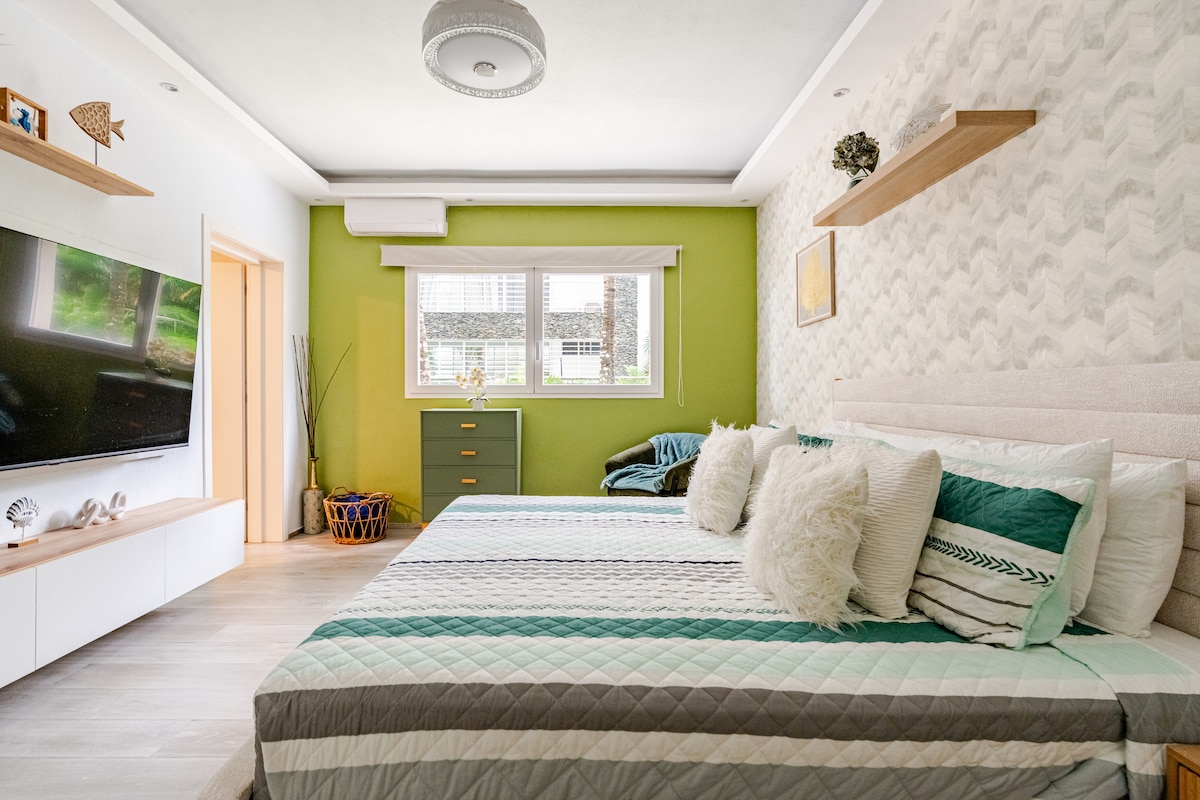 A solo 1 minuto caminando de la playa privada (visible desde la puerta del apartamento), ubicado en área más exclusiva de Bayahibe, Dominicus. Dentro del exclusivo resort Cadaqués: 3 piscinas, muelle privado, parque acuático, restaurante, bar-café, jardines tropicales, Cama king cómoda y sábanas de 300 hilos, A/C de 24,000 BTU, silla columpio (hasta 350 lb), cocina equipada, WiFi rápido y Smart TV, libros, juegos de mesa. Todo listo para que vivas una estadía inolvidable y cómoda en el paraíso!