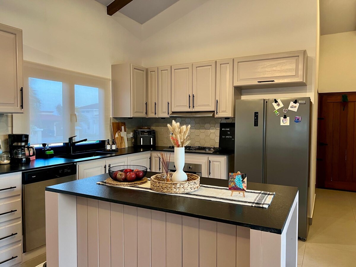 Con un moderno diseño tropical, esta casa cuenta con una acogedora sala de estar y una elegante cocina en el centro del área social. Abre las puertas de cristal para sumergirte en una vida de concepto abierto, que combina a la perfección el interior con la terraza principal y la piscina, todo ello orientado hacia la vista al mar. Con dos dormitorios en suite con aire acondicionado y ventiladores, la casa está inmersa en la naturaleza, montañas verdes y un hermoso jardín, todo a 5 minutos del centro de la playa.