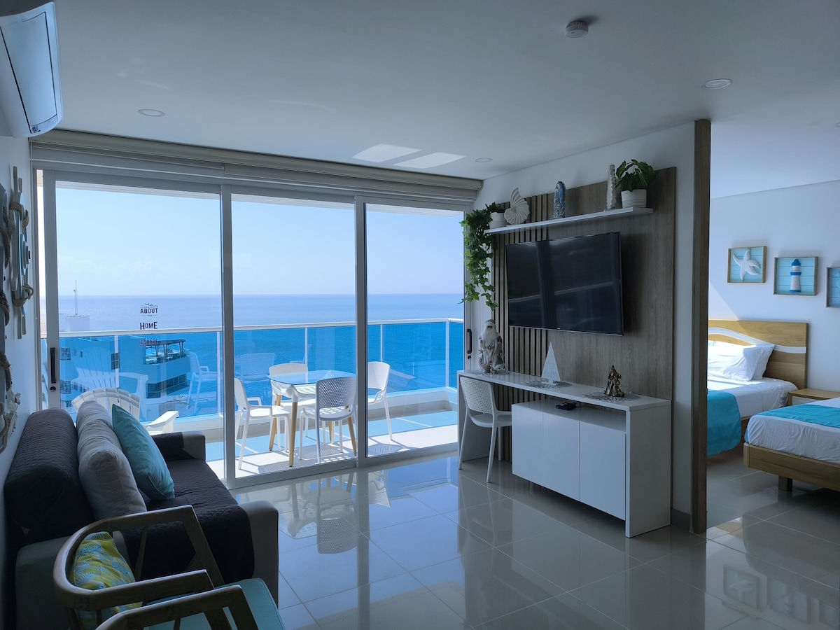 Apartamento moderno y tranquilo con vista al Mar Caribe, 1 habitación con cama doble, AA, TV Smart y baño con ducha de agua caliente. Sofa cama doble con vista al balcón, con AA, TV Smart y segundo baño con ducha. Internet fibra óptica alta velocidad, sala, comedor, escritorio, cocina, lavadora, parqueadero cubierto, ascensores, vigilancia 24 horas. Salida directa a la playa. A pie de gran variedad de excelentes restaurantes, supermercados, almacenes, agencias de viajes, bancos y vida nocturna.